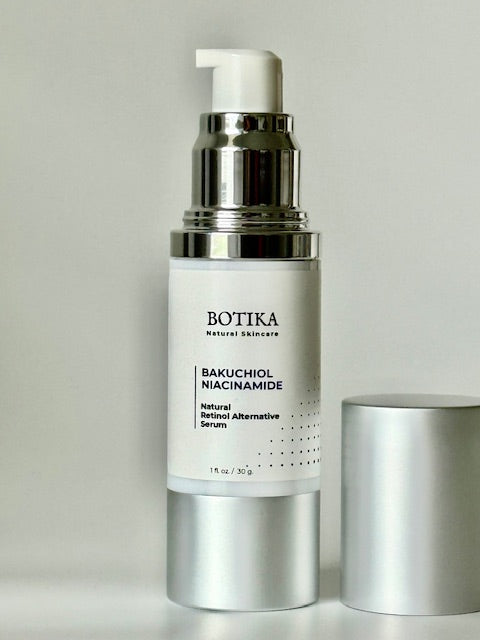 Natural Retinol Alternative Serum. Formulated with 99% Bakuchiol Extract. This retinol alternative serum delivers anti-aging benefits without irritation. Enriched with Niacinamide to brighten and refine pores, and Hyaluronic Acid for deep hydration, it leaves skin smooth, radiant and youthful.