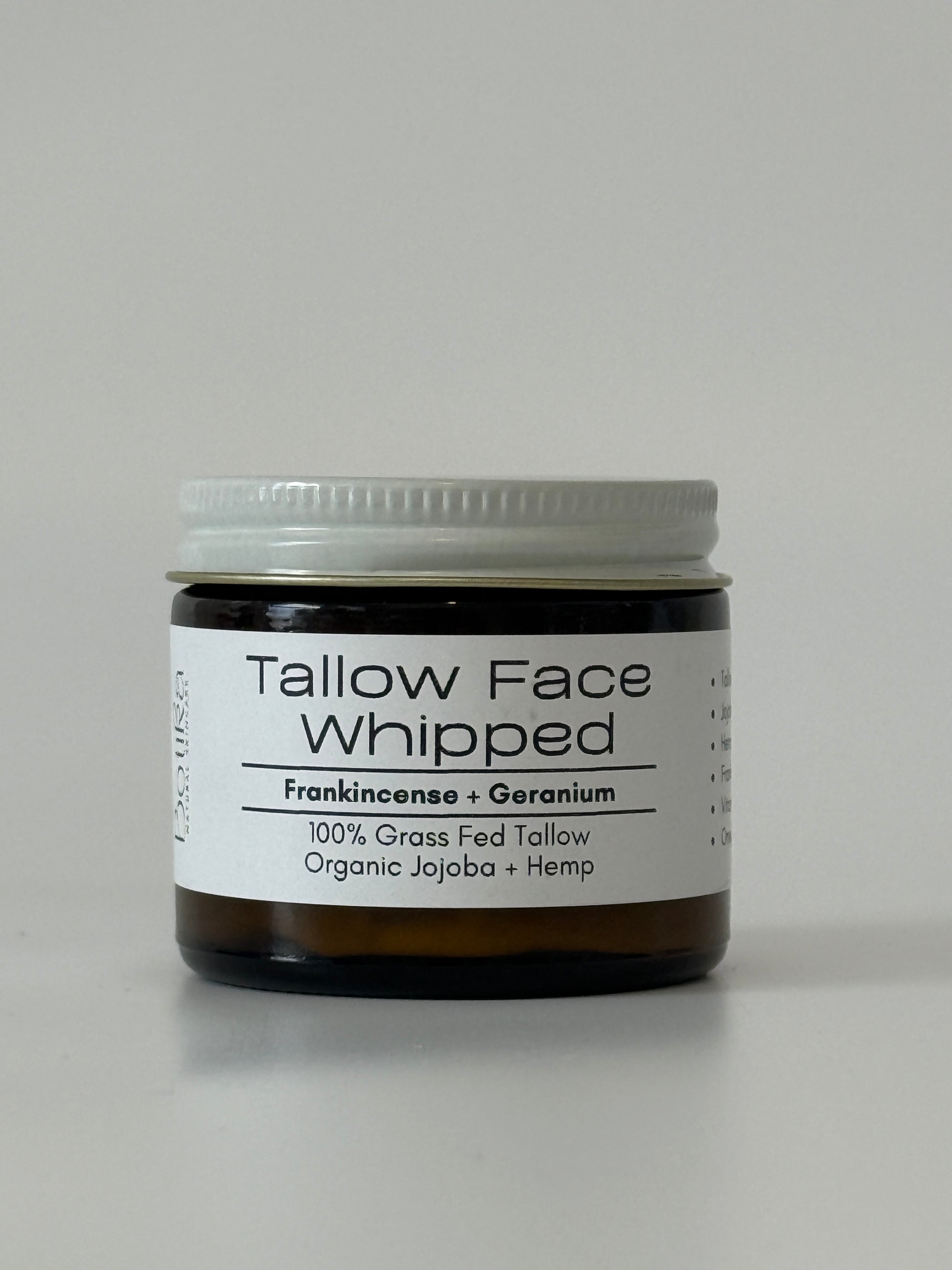 Deeply nourishing and calming, this whipped blend of grass-fed tallow, jojoba oil, and hemp seed oil supports your skin’s natural barrier. Infused with frankincense and geranium essential oils to soothe and restore balance. Perfect for dry, sensitive, or mature skin.